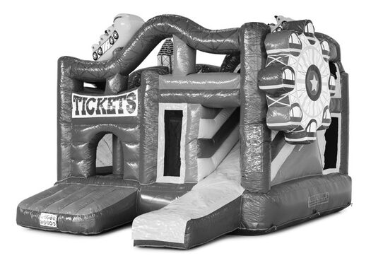 Groot opblaasbaar open multiplay springkussen met glijbaan kopen in thema achtbaan rollercoaster voor kinderen. Bestel springkussens online bij JB Inflatables Nederland