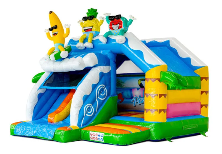 Het is altijd een zomers feestje met dit vrolijke springkussen! Spring erop los met de vrolijke banaan, ananas en meloen! Op het Slide Combo Doubleslide Summer Party springkussen zijn alle mogelijkheden voor urenlang speelplezier. Klim erin, spring erop los en roetsj van de glijbaan zo het badje in! De keuze is reuze, want er zijn zelfs twee glijbanen op dit te gekke springkussen.