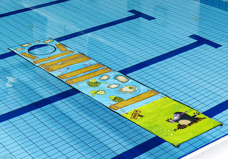 De survivalmat met gat kan in het zwembad op veel manieren worden gebruikt. Ren erover heen, zwem er onder door of duik door het gat: zwemmen en leren zwemmen is nog nooit zo leuk geweest! Deze survivalmat is ook leverbaar met je eigen ontwerp, bijvoorbeeld met jouw zwembadmascotte of logo er op geprint. Vraag ons gerust naar de mogelijkheden!